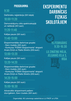 Eksperimentu darbnīcas fizikas skolotājiem norisināsies 15. februārī no plkst. 9:30 līdz 16:30 Latvijas Universitātes Zinātņu mājā Rīgā, Jelgavas ielā 3. Pasākuma laikā skolotajiem būs iespēja vērot demonstrējumus spektroskopijā (gaismas izstarošanās, izplatīšanās, atstarošanās, laušana, dispersija, difrakcija, baltās gaismas spektrs, gaismas absorbēšana, absolūti melnais ķermenis, lāzeri, luminiscence, spektrālanalīze, gaismas filtri, fotosintēze, līnijspektri), kā arī pašiem veikt eksperimentus mehānikā, optikā, siltumā un elektromagnētismā. Pasākuma dalībniekiem kopā ar erudīcijas konkursa "FIZMIX Eksperiments" ekspertiem Aivaru Eriņu un Raiti Streiču būs iespēja veikt un analizēt iepriekšējo gadu konkursa praktiskos darbus.