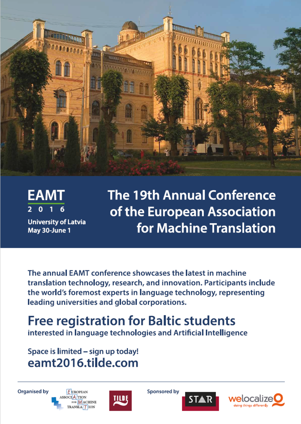 EAMT 2016 konferencē tiks prezentēti jaunākās mašīntulkošanas tehnoloģijas, rīki, un inovācijas. Starp dalībniekiem ir pasaules valodas tehnoloģiju eksperti, kas pārstāv vadošās universitātes un globālas korporācijas.